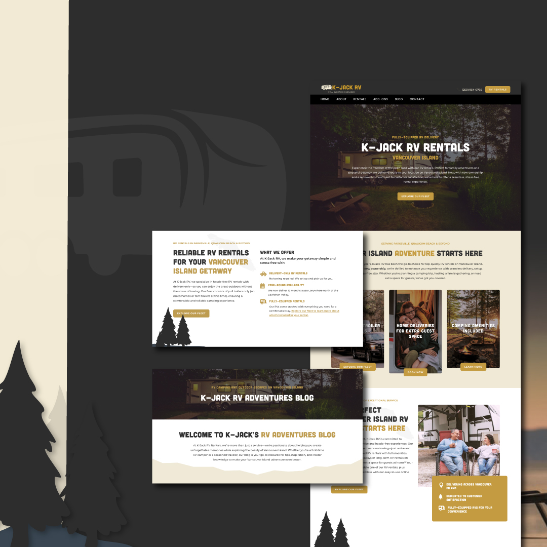 K-Jack RV Rentals needed a website that made it effortless for adventure seekers to find and book 5th wheel trailer rentals on Vancouver Island. The goal was to create a seamless and engaging digital experience that showcased their fleet, simplified the reservation process, and highlighted their delivery and setup services—allowing campers to enjoy the outdoors without the hassle of towing.