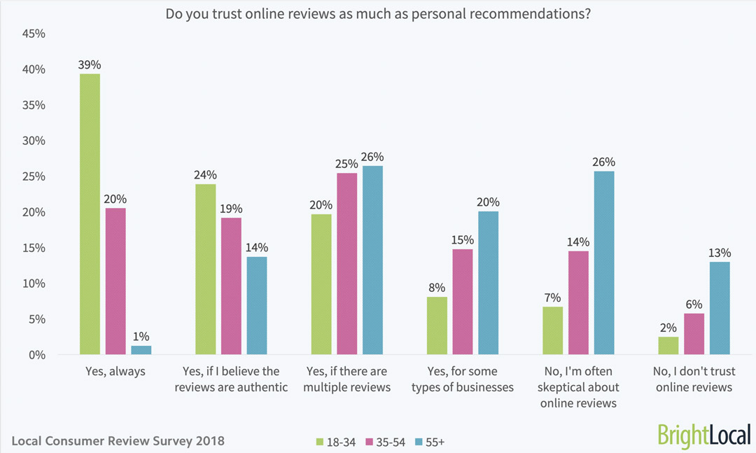 BrightLocal’s local consumer survey shows that 91% of consumers between the age of 18 to 34 are big believers of online reviews, trusting them as much as personal recommendations.