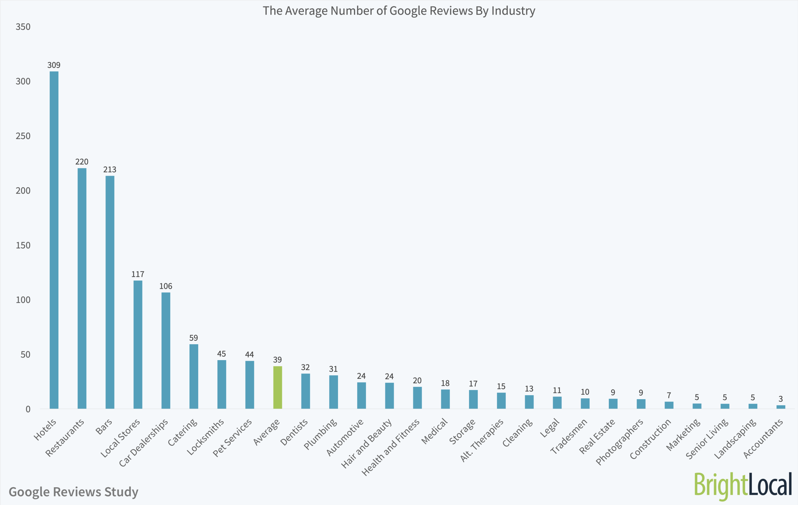 BrightLocal’s Google Reviews Study shows that the average local business that appears on Google has 39 reviews. This number, however, varies greatly between industries.